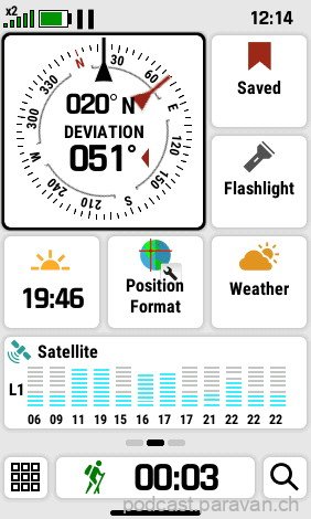 Auch eine gute Funktion ist, dass man einstellen kann, dass das H1 automatisch mehrere Navigations-Systeme (GPS, Galileo, Glonass) nutzt, angezeigt durch ein x2 in der oberen linken Ecke, wenn der Empfang nicht so gut ist (was an meinem Test-Tag mehrmals der Fall war). Ist der Empfang genügend gut, nutzt das H1 nur das präferierte System und spart dadurch auch Strom.