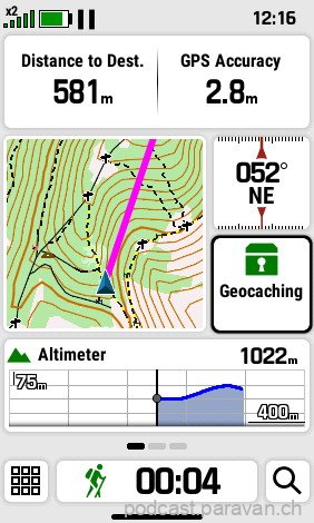 Eine andere Möglichkeit ist, Seiten einzurichten, zwischen denen ähnlich wie beim Smartphone hin und her gewischt werden kann. Die verschiedenen Bereich der Seiten lassen sich sich selber definieren. Man weisst einem Bereich z.B. die Karte, das Geocaching und gewisse Datenfelder zu und sieht diese dann, je nach dem mit einigen Informationen davon nebeneinander. Ein Klick auf das entsprechende Feld öffnet dann z.B. Karten- App. Auf der Seite sieht man dann z.B. einen Ausschnitt der Karte und das aktuelle Höhenprofil. Klickt man nun auf die Karte, öffnet sich dieser bildschirmfüllend. Einfach gelangt man wieder zurück zur Hauptseite.